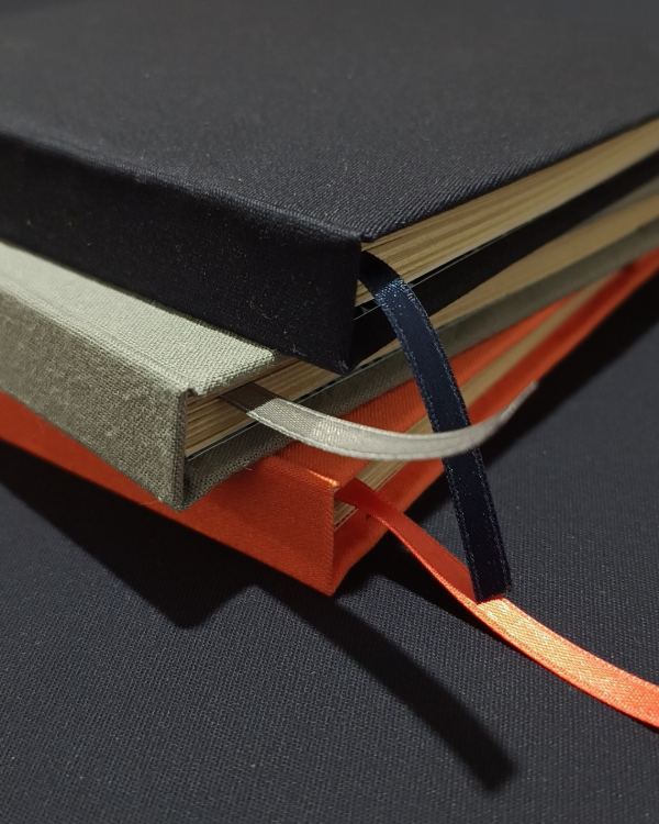 Bitácora elaborada de manera artesanal con costura tradicional, tapas duras y lomo recto, forrada de tela con base de algodón.