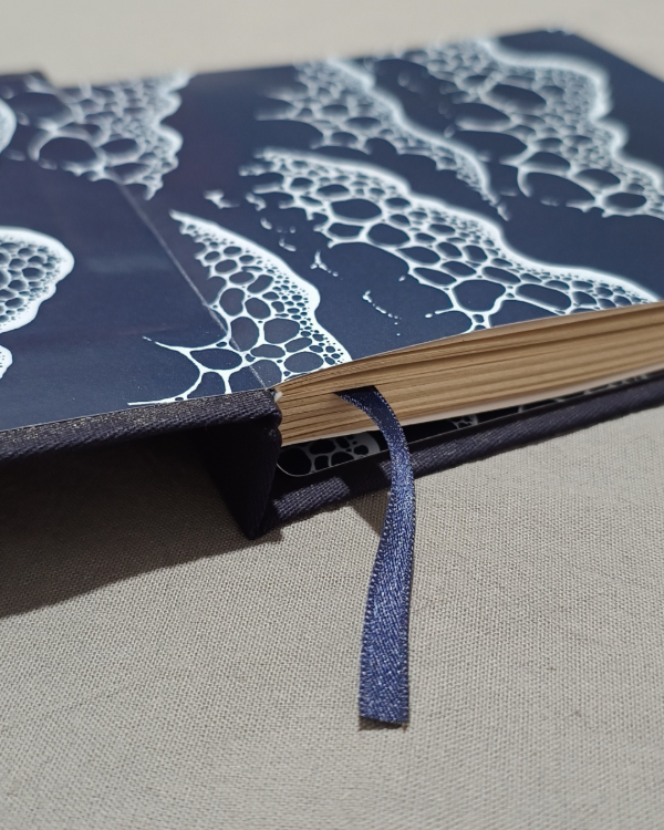 Está hecha con 80 hojas de papel ecológico. Cuenta con cinta señaladora, y hojas de guarda con nuestro papel "espuma de mar", diseñado por nosotras.