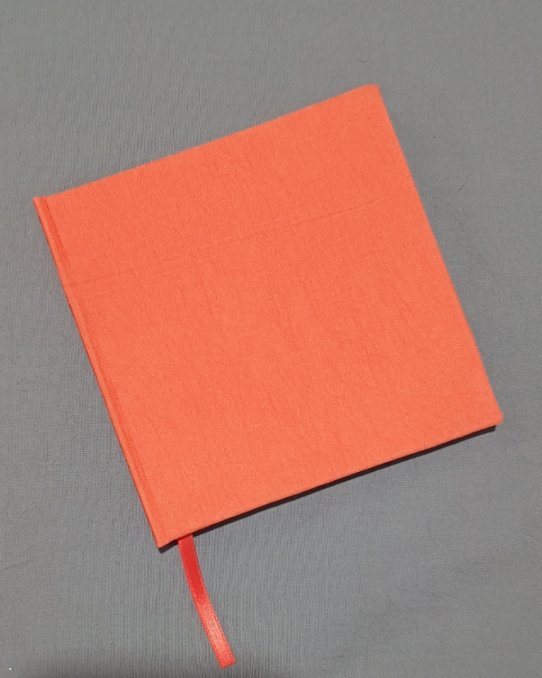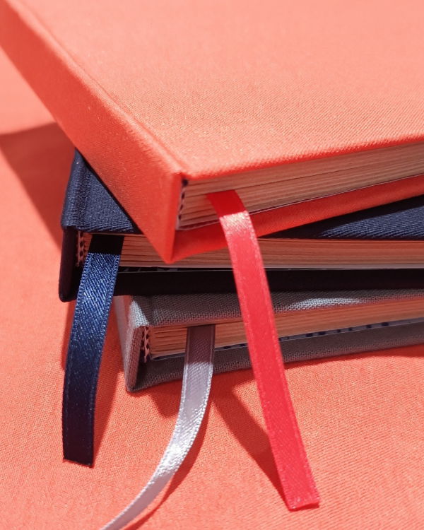 Bitácora elaborada de manera artesanal con costura tradicional, tapas duras y lomo recto, forrada de tela con base de algodón.
