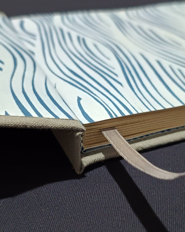Está hecha con 80 hojas de papel ecológico. Cuenta con cinta señaladora, y hojas de guarda con nuestro papel "ondas de mar", diseñado por nosotras.