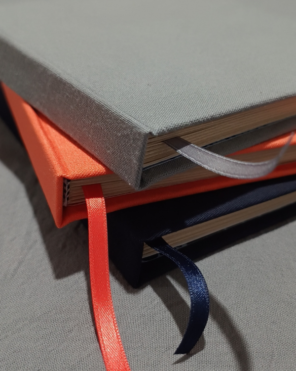 Bitácora elaborada de manera artesanal con costura tradicional, tapas duras y lomo recto, forrada de tela con base de algodón.