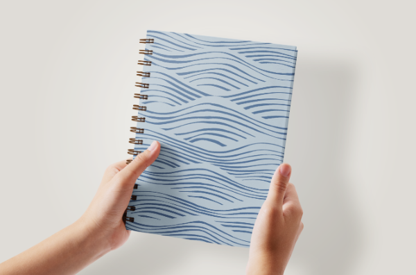 Bitácora anillada tamaño A5, de tapa dura, forrada con el papel "ondas de mar" de nuestra autoría.