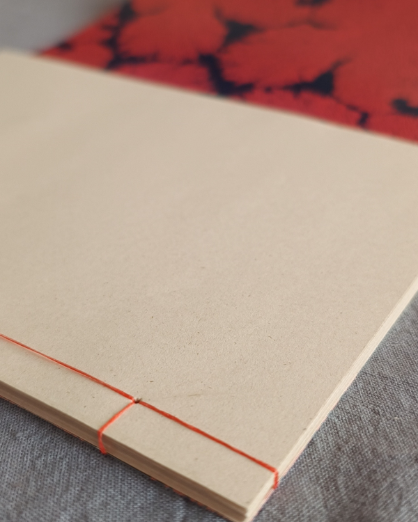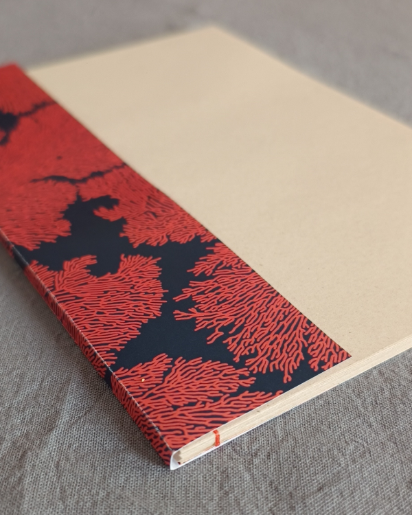 Cuaderno tamaño A5 con tapa blanda, hecha con el papel "coral" de nuestra autoría.