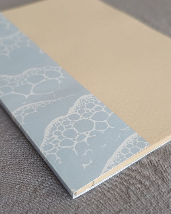 Cuaderno tamaño A5 con tapa blanda, hecha con el papel "espuma de mar" de nuestra autoría.