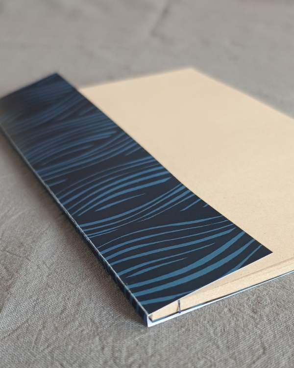 Cuaderno tamaño A5 con tapa blanda, hecha con el papel "ondas de mar" de nuestra autoría.